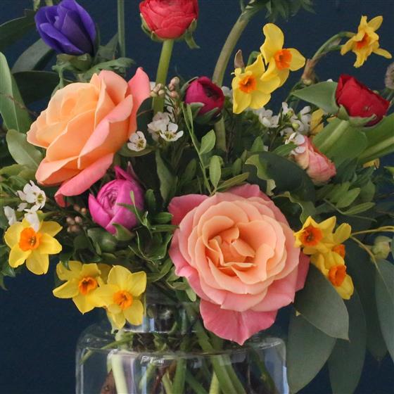 A beautiful florist choice spring selection of flowers in a glass vase.