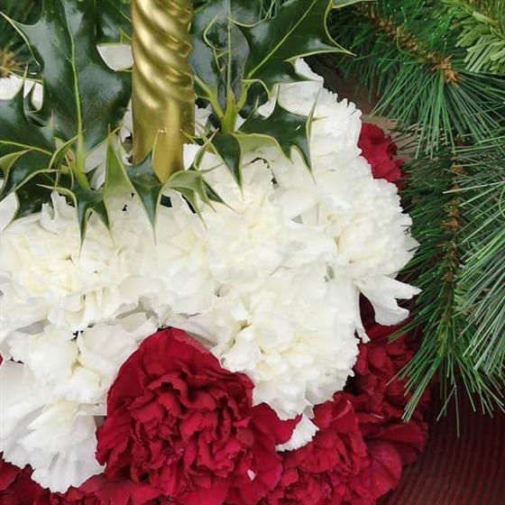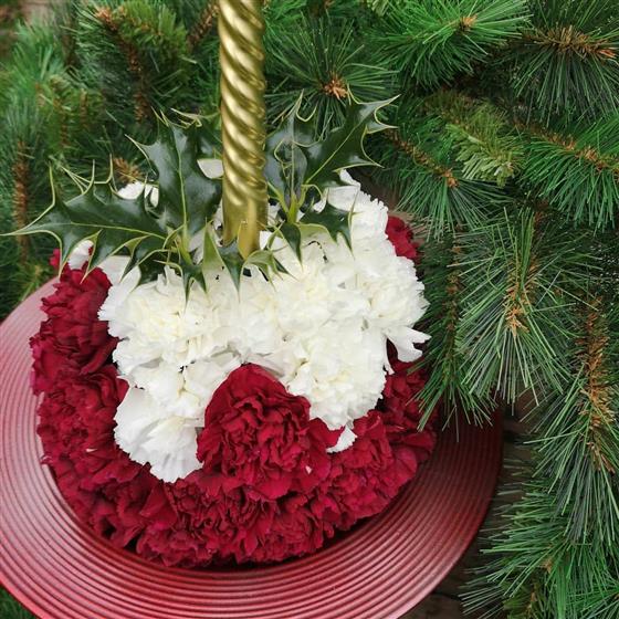 This clever arrangement is a fun and festive addition to your Christmas table. Pretty clove and white carnations are arranged to create a floral Christmas pudding that will delight your friends and family. Delivered on a festive charger plate.