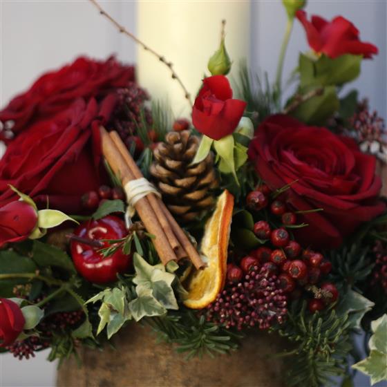 Lovely table centre set in a ceramic pot. Features red seasonal flowers, festive foliages, decorations and a chunky church candle.