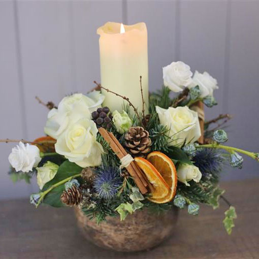 Lovely table centre set in a ceramic pot. Features white seasonal flowers, festive foliages, decorations and a chunky church candle.