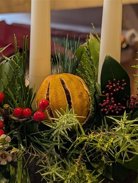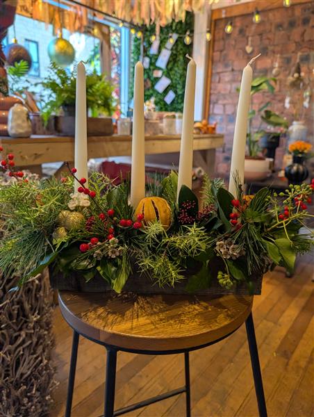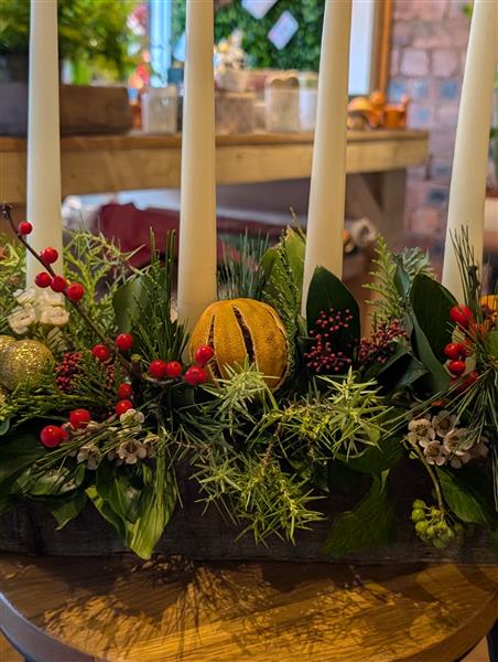 This sweet arrangement is perfect for you festive table, with tapered candles and the lush scent of festive foliage.