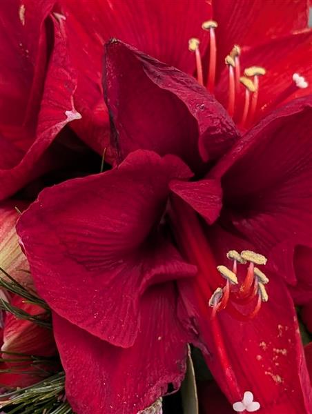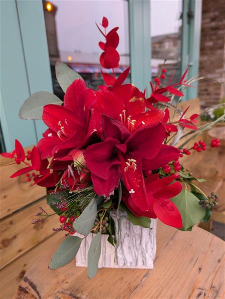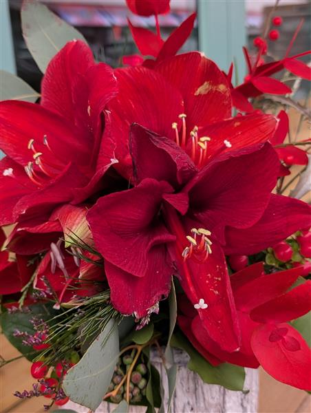 Birch covered container, scented spruce, cinnamon, Amaryllis, seasonal berries combine to make this beautiful Christmas table centre.
