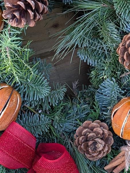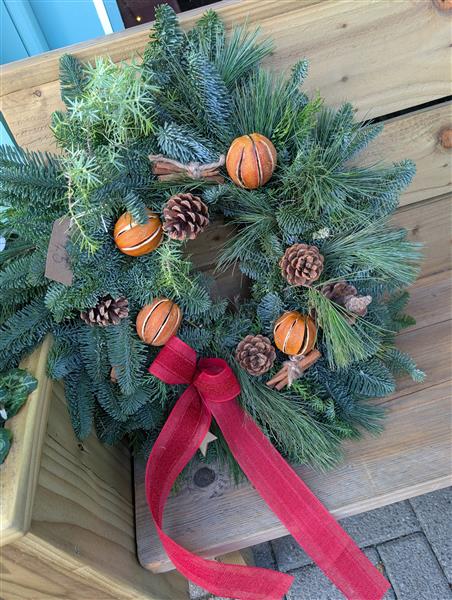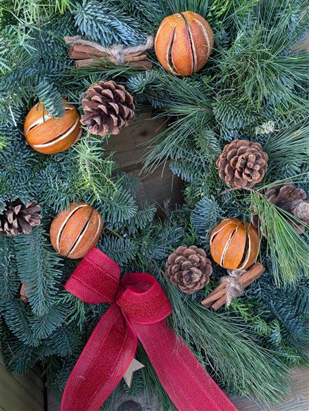 A fresh, individually hand made festive wreath created using seasonal foliage, cones, dried orange slices and other seasonal decorations. Festive ribbon included, design may vary from image.