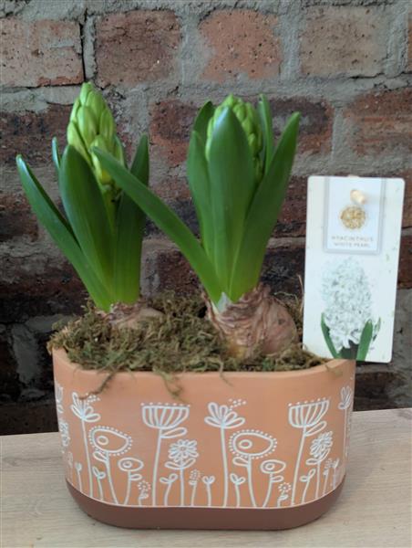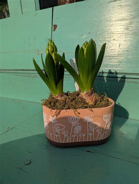 Cute woodland container with hyacinth in ceramic on variety of pastel colours. The perfect fragrant gift for Spring.