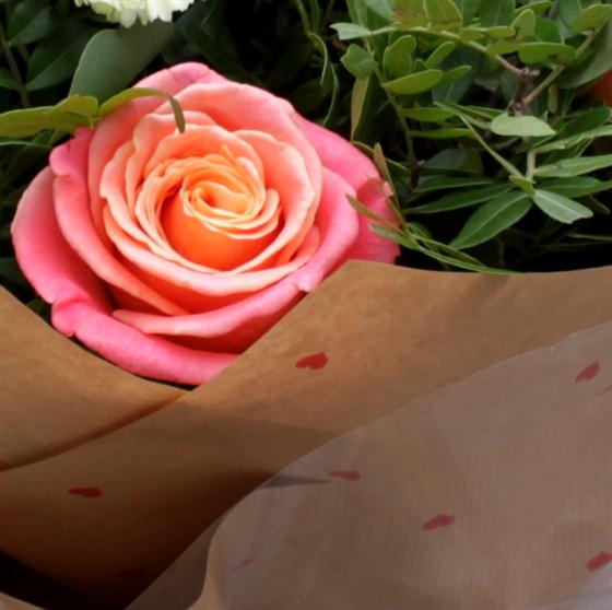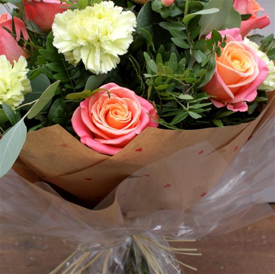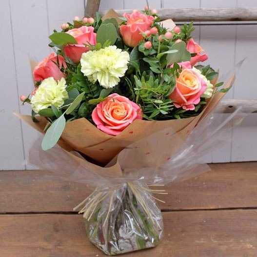 Half a dozen beautiful Miss Piggy or Peach Avalanche roses, pastel green carnations, berries and seasonal foliage hand tied.