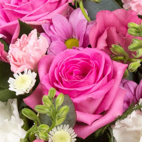 A compact posy arrangement created using seasonal flowers and foliage. Available in pink and cream as pictured or a range of different colours.