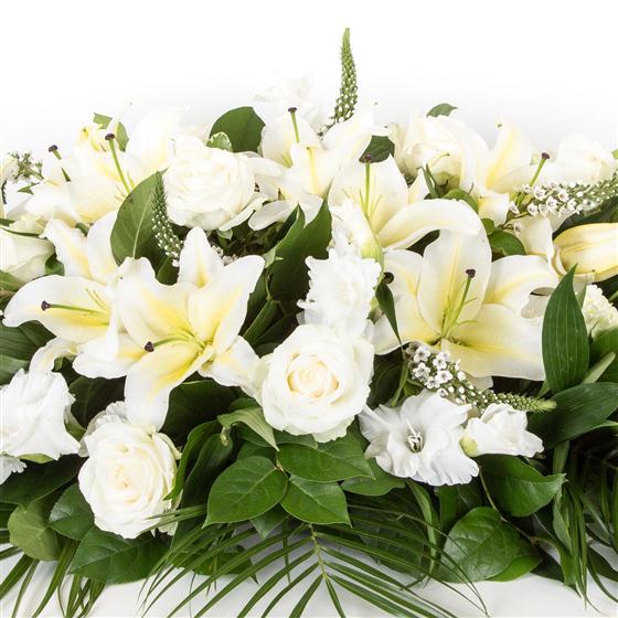 A classic all white oriental lily and rose casket spray. Please give ample time when ordering to ensure lilies are in full bloom.